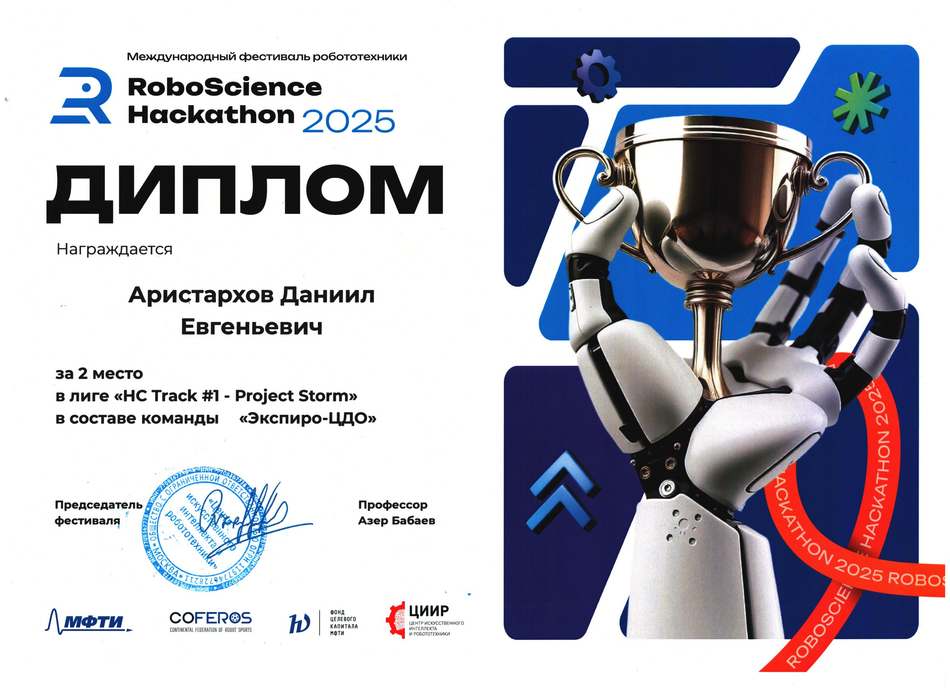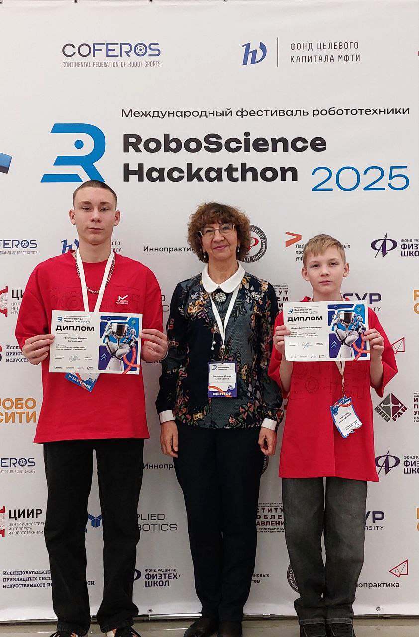 Учащиеся детского объединения «Робототехника» Центра дополнительного образования (ЦДО) Даниил Аристархов и Арсений Шокин вернулись с наградами с III Международного фестиваля робототехники RoboScience Hackathon 2025. Мероприятие проходило с 21 по 23 ноября на базе технопарка «Физтех-лицея» имени П.Л. Капицы в г. Долгопрудный и собрало сотни талантливых школьников и студентов из России и дружественных стран. Фестиваль RoboScience Hackathon позиционируется как масштабная площадка для развития инноваций и интеллектуального творчества.