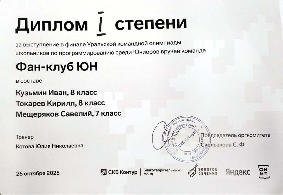 Команда «Фан-клуб ЮН» в составе Кузьмин Иван (8 кл), Мещеряков Савелий (7 кл), Токарев Кирилл (8 кл) приглашена в финал Старшей лиги командной олимпиады УРКОП-2025 для 9-11 классов и побороться за место в составе делегации Свердловской области на Всероссийскую командную олимпиаду школьников. Пожелаем ребятам успеха и новых достижений!